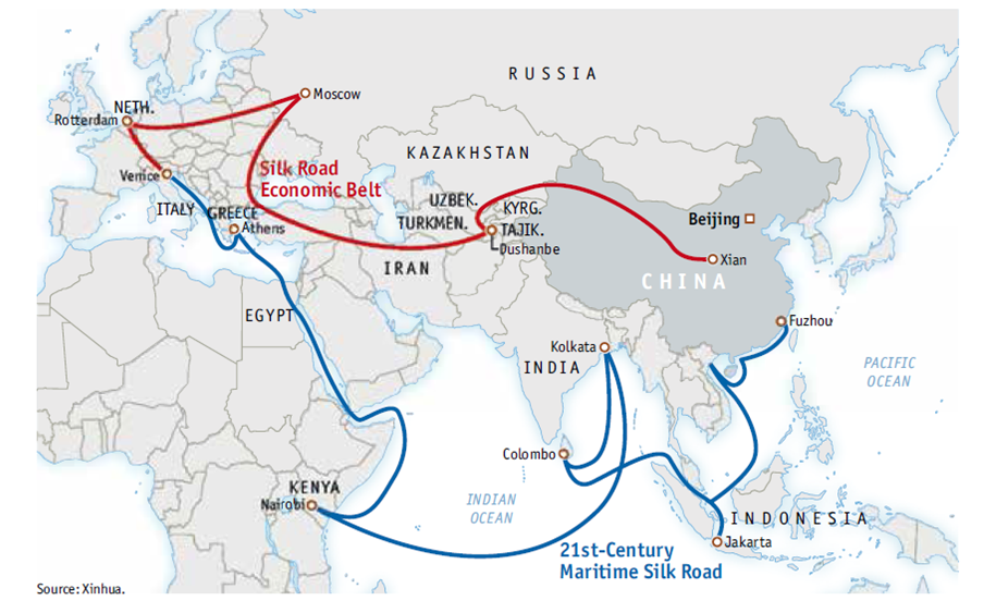 चीनचे राष्ट्रपती झी झिनपिंग ह्यांनी २०१३ मध्ये ‘One Belt One Road’ ही घोषणा केली. सिल्क रोड इकोनोमिक बेल्ट SERB व मेरीटाइम सिल्क रोड MSR द्वारे संपूर्ण जग इंफ्रास्ट्रक्चरच्या माध्यमातून व्यापारासाठी जोडण्याचा विचार मांडला.SERB हा जूनी राजधानी Xi’an पासून जगाला जोडत व्हेनिसपर्यन्त (इटली)असुन MSR ने सागरामार्गे संपूर्ण पृथ्वीभोवती विळखा घालण्याची तयारी आहे. माओच्या ‘लीप फॉरवर्ड मार्च’ आणि 1970मध्ये सत्तेेत असलेल्या दंग झिओफंगची’गो वेस्ट पॉलीसी’; हयांचे एकत्रीकरण.